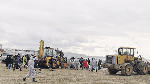 Из наиболее поражённых мест черноморского побережья в Анапе - станицы Благовещенской и села Витязево - вывезли уже больше 14 тыс. т загрязнённого песка, сообщил министр природных ресурсов и экологии России Александр Козлов. Он приехал осмотреть территорию, пострадавшую после аварии двух танкеров с нефтепродуктами. Позже глава Краснодарского края уточнил, что по итогам дня собрана 21 тыс. т. грязного грунта. Волонтёры едут в Краснодарский край из разных частей России, местные жители охотно присоединяются к добровольческим штабам по очистке побережья и помощи птицам, рассказали они "Известиям". Некоторые местные жители создают небольшие группы помощи там, где не хватает волонтёров. О тех, кто едет ликвидировать загрязнение мазутом,- в материале "Известий".
